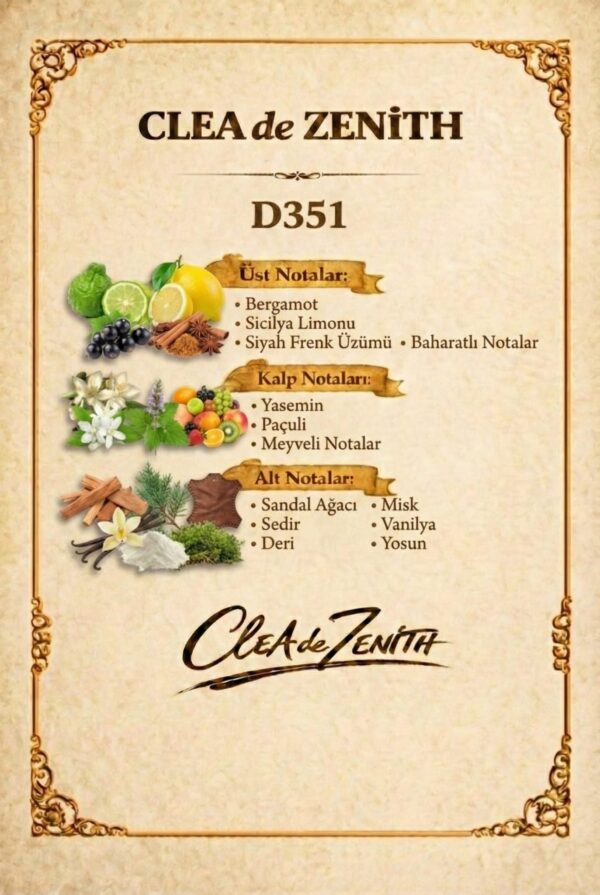 Bu parfüm, enerjik ve zarif havasıyla ön plana çıkıyor. Taze ve ferah narenciye notalarıyla başlayıp, odunsu ve baharatlı notaların derinliği ile zenginleşiyor. Meyvemsi, balsamik ve maskülen bir karakter taşımasının yanı sıra kadınlar için de tasarlanmış bir koku olarak çok yönlü bir kullanım sunuyor.
