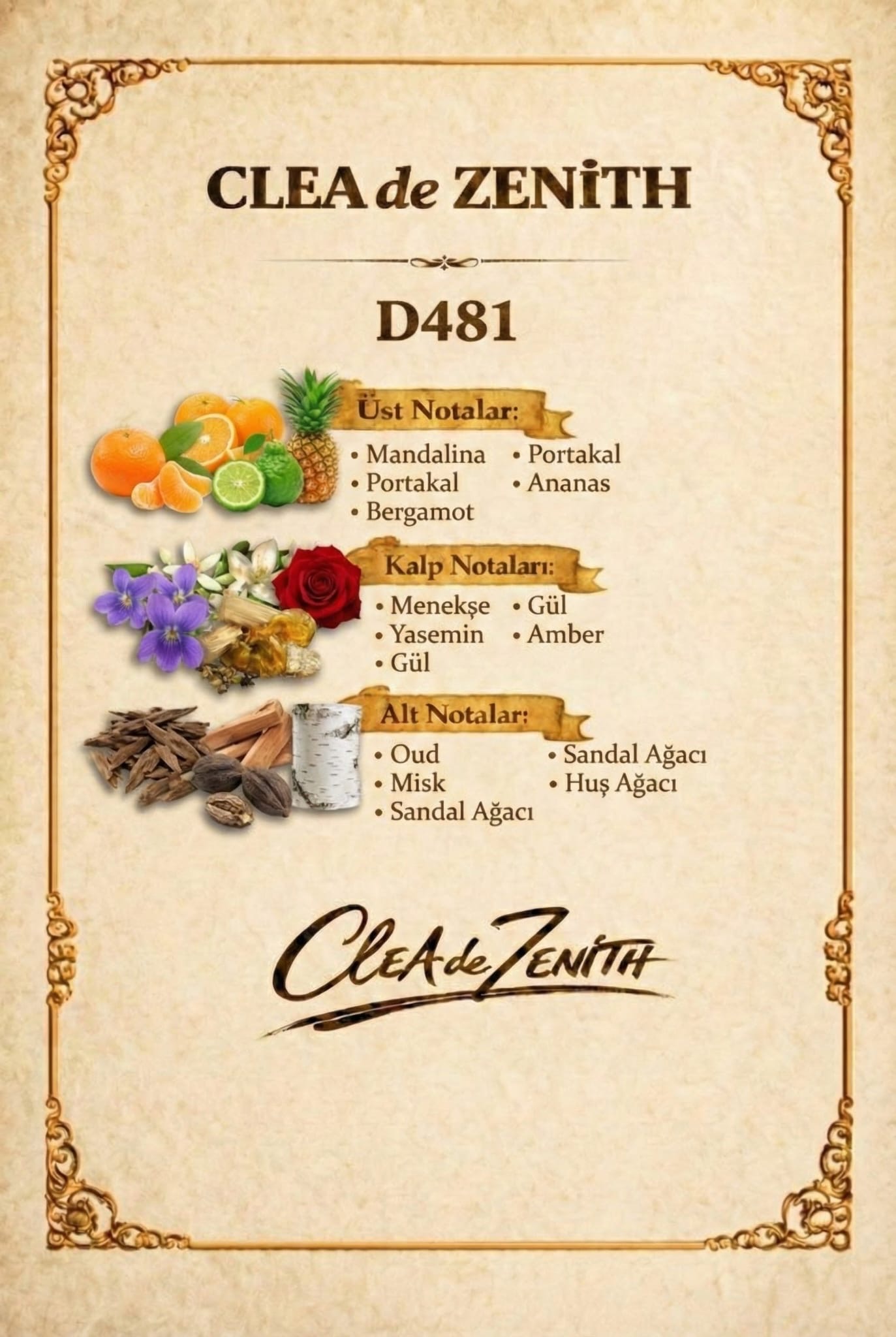 D481, eğlenceli ruhu sofistike bir zarafetle buluşturan modern ve bağımlılık yaratan bir kokudur. İlk sıkıldığında meyvemsi ve tatlı bir patlama yaratır; canlı narenciye dokunuşları ve sakız akoru ile enerjik, neşeli ve dikkat çekici bir açılış sunar.