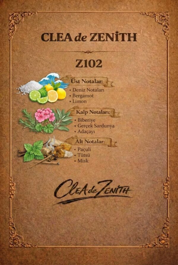 Z102, temiz ve doğal karakteriyle erkek parfümlerinin zamansız ikonlarından biridir. İlk anda ferah narenciye notalarıyla serinletici bir etki yaratır, ardından aromatik ve odunsu dokunuşlarla dengeli bir derinlik kazanır. Doğal, sade ama son derece etkileyici…